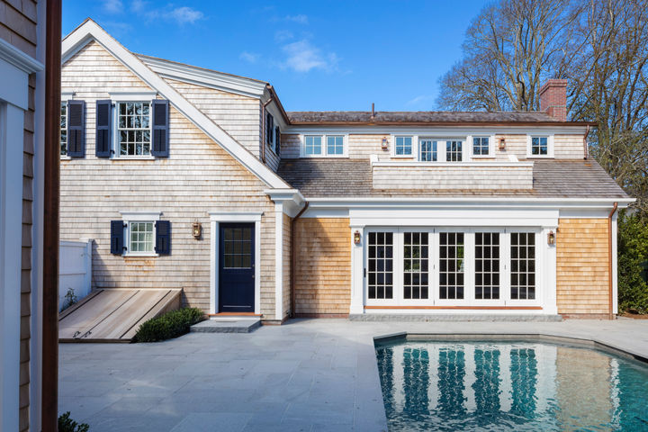 Mindful of the distinctive history of the Edgartown Historic District, an historic renovation reformed this 18th century home. Working on a small lot presented a challenge at first; however, the renovation provided the homeowners with a new pool cabana, basement, carriage house, and second story addition at the rear of the home. The traditional cape style architecture of the home was a priority to maintain: the perfectly positioned chimney, steep cedar roof, and window above the main entrance. This home falls in step with other historic homes in the area.